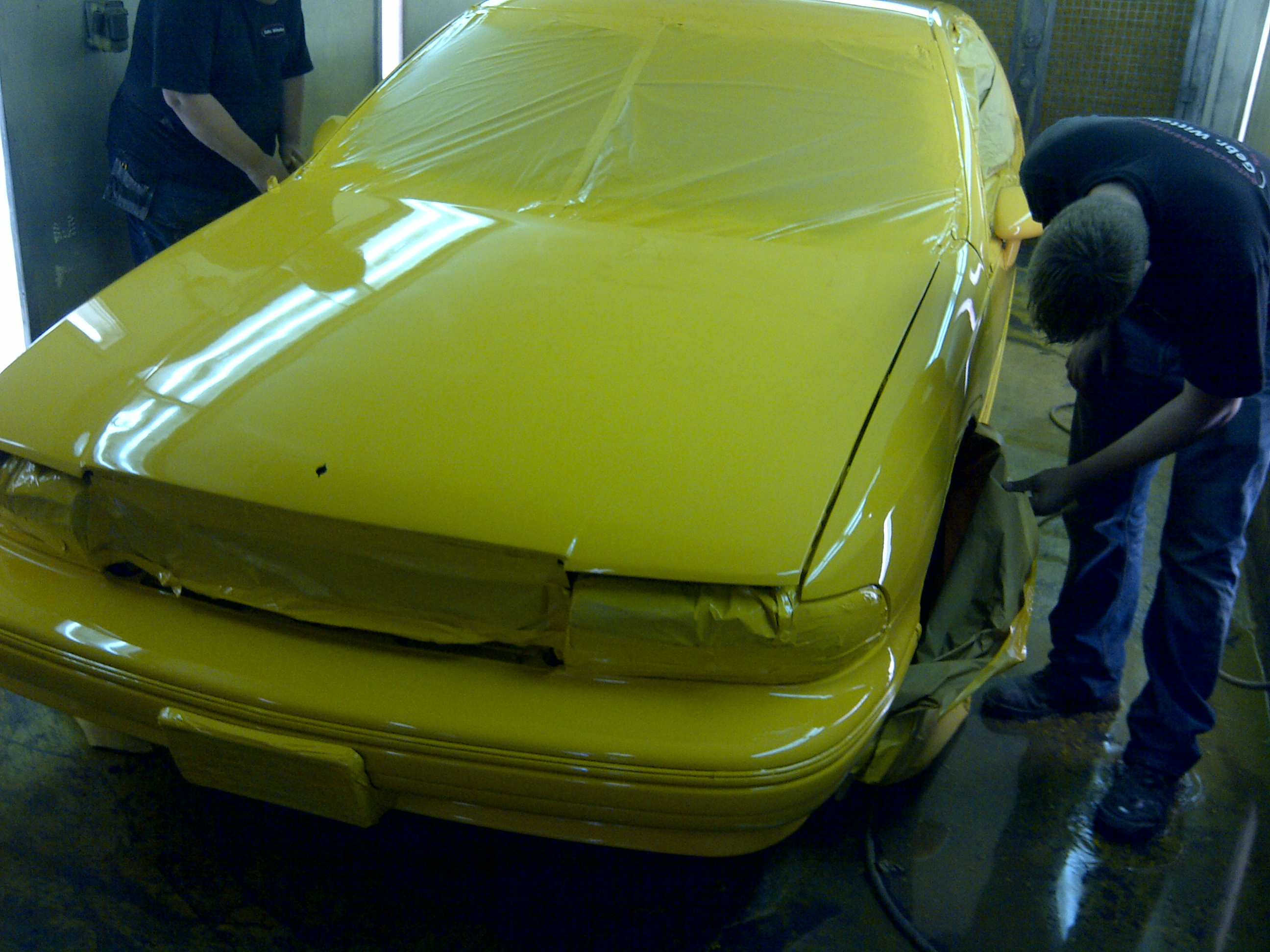 De auto wordt zorgvuldig gespoten in een spuitcabine met een speciaal luchtverwarmings- en circulatiesysteem zodat de lak optimaal uithardt.